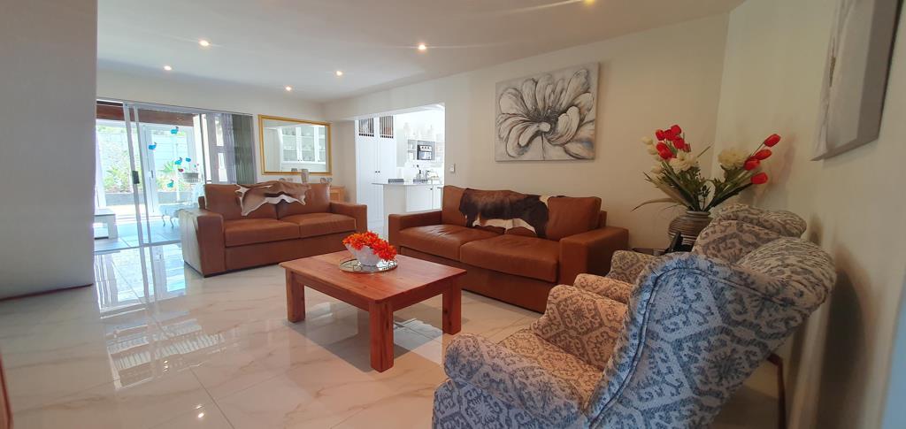 Entertaining is effortless. An indoor braai keeps things cosy in winter, while stack doors open wide to a garden with beautiful mountain views where summer evenings stretch long and laughter carries into the garden. The seamless indoor-outdoor flow, paired with sleek porcelain tiles, creates a modern yet relaxed coastal elegance.