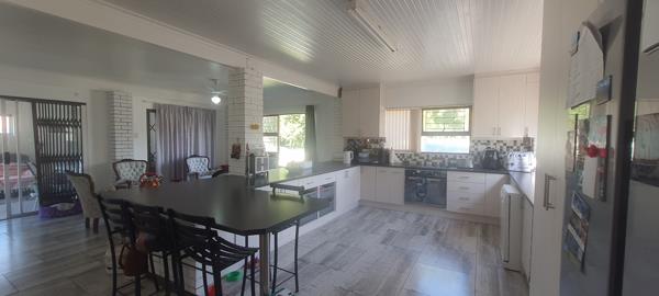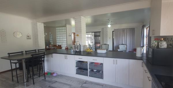 Downstairs, the home features a large open-plan lounge and modern kitchen area, ideal for family living and entertaining. An enclosed braai room adds to the charm, offering a cozy space for gatherings, especially on chilly winter days.