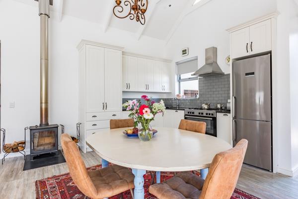 Exclusive Sole Mandate presented by Erika. This architecturally designed residence showcases a harmonious blend of exquisite finishes and spacious, double-volume living and sunny reception areas. The open-plan living and dining areas feature large north-facing floor-to-ceiling stack doors, complemented by security shutters, and seamlessly extend to a charming patio with a built-in braai, perfect for outdoor entertaining. A cozy combustion wood burner adds warmth and ambiance during the winter months. The kitchen is equipped with granite counter tops, ample cabinetry, and a sizable separate scullery that accommodates all appliances, with direct access to an automated double garage.