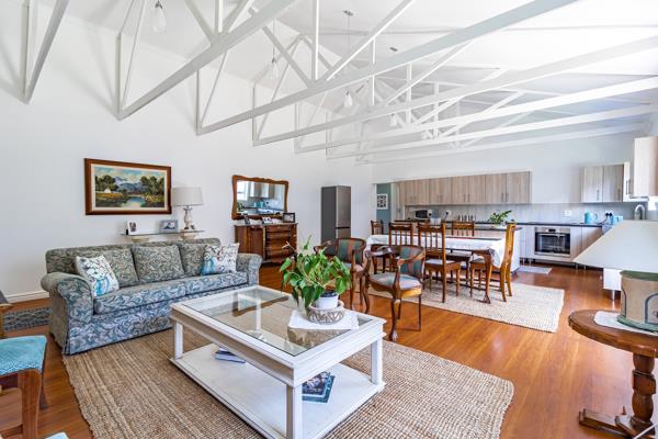 The home features a spacious open-plan living area with high ceilings and open trusses that allow natural light to flood in. It seamlessly connects to a large open-plan kitchen, which includes a convenient movable island and a fitted stove. Additionally, there is a guest toilet for convenience.