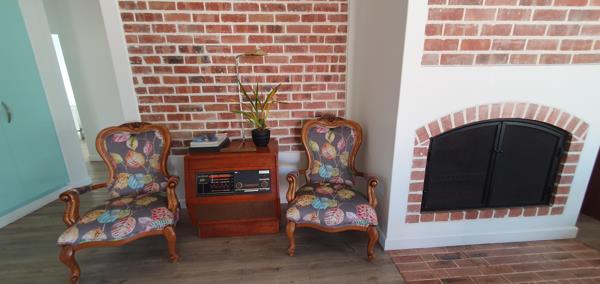 The living area opens onto a sun-filled patio with a braai, overlooking a tastefully landscaped garden with a tranquil fountain and picturesque mountain views.