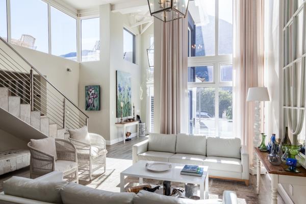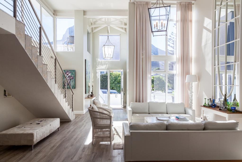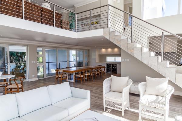 The main living room area is on the seaside of the house in a double volume space which has ample seating for large family gatherings and entertaining. The street level leads onto the middle floor of the house, where glass sliding doors allow the open living areas to flow onto a full-width terrace, overlooking a full-size swimming pool, with safety net, braai lapa, fire pit an jacuzzi below, with its own private bar and entertainment area with pool table.