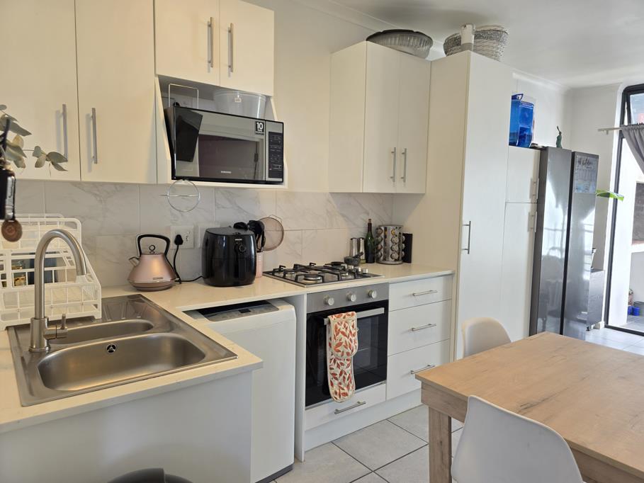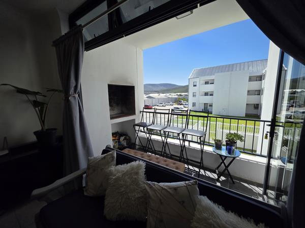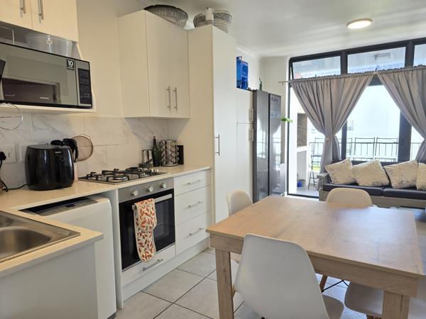 The open-plan living area flows effortlessly to a private balcony with a built-in braai area, perfect for relaxed evenings or entertaining guests. The modern kitchen includes space for all your appliances and boasts sleek finishes throughout.