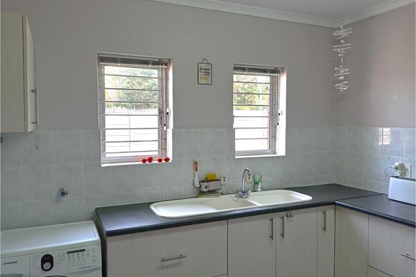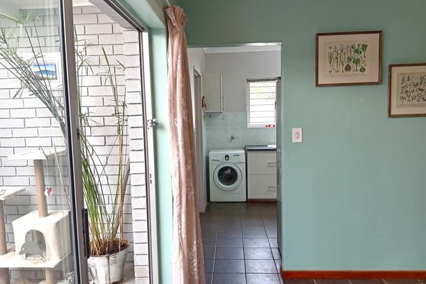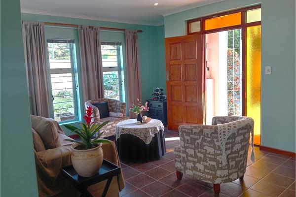 Through the wooden front door with security gate and lovely coloured glass panes, one enters the lounge with windows providing views overlooking the garden and mountain views can be enjoyed through the front door and garden.