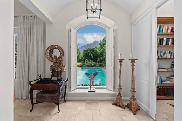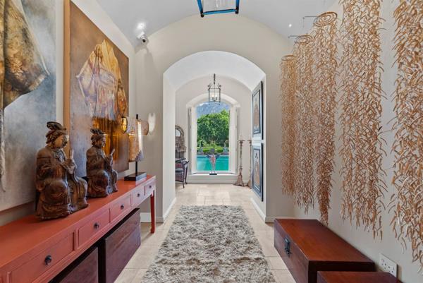 Through grand double doors, you enter a dramatic entrance hall with a domed ceiling, twinkling lights and, a window framing the lap pool, front garden, and mountains.