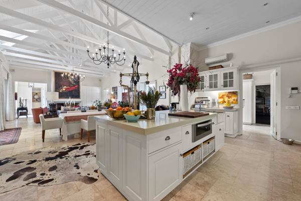 The kitchen is a culinary haven with sandstone tops, a generous pantry and, integrated Miele appliances steamconvection ovens, microwave, warming drawer, induction, gas hob, wok, wine fridge, dishwasher, fridge-freezer framed by hand-painted cabinets and dimmable lighting. A scullerylaundry links to a sunlit greenhouse and additional storage.