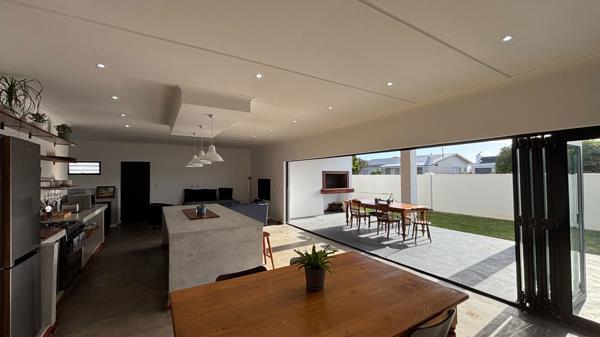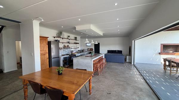 Upon entering the house, you are welcomed by a spacious open-plan living, dining, and kitchen area. The kitchen is elegantly designed with a center island, chandeliers, and concrete framed cupboards and shelving, complete with an indoor fireplace. Leads out to an undercover patio with an outside braai area and splash pool, ideal for hosting gatherings with family and friends.