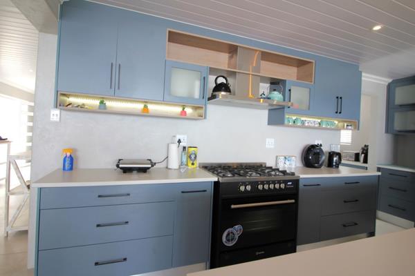 The ground floor welcomes you with an open plan living, dining area, kitchen, and bar that seamlessly flow out onto the expansive patio. The kitchen is a showstopper, featuring beautiful built-in cupboards, a separate scullery, and a pantry. The bar is ideal for entertaining guests, and the patio with a braai offers breathtaking views of the beach and oceanan absolute paradise for outdoor gatherings.