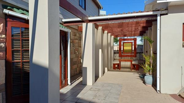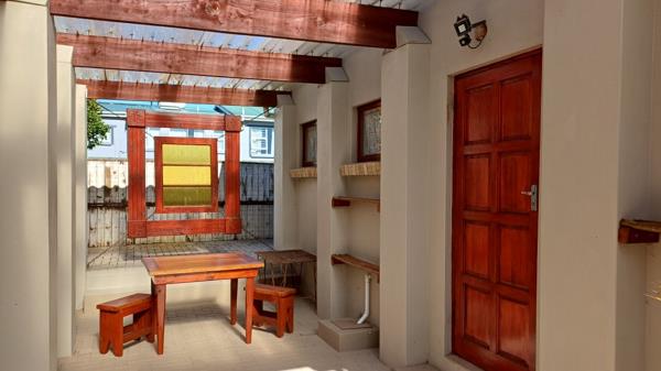 bathroom. Features a private lounge-dining area and kitchenette. Offers independent access via the bedroom to the front yard, and a secondary door leading directly to the built-in braai area and covered stoep.