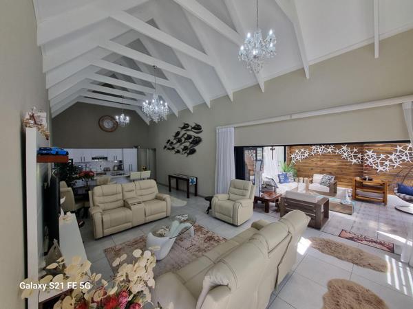 Enjoy bright open-plan living with high exposed trusses, quality finishes throughout, and a spacious enclosed braai room ideal for year-round entertaining. The kitchen features ample cupboards, an electric hob and oven, plus a separate scullery. The main bedroom includes an en-suite, while two additional bedrooms share a full second bathroom.
