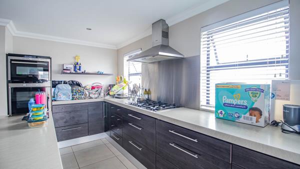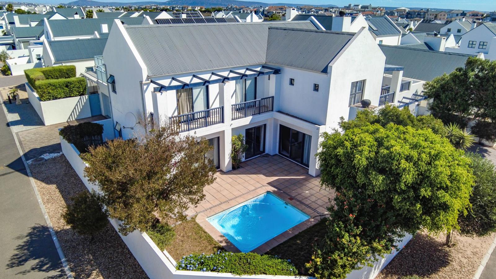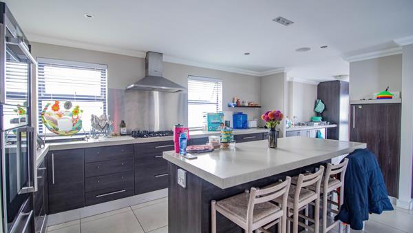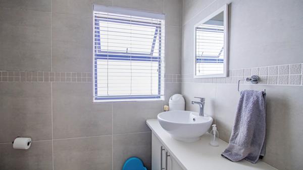 The upper level offers two additional bedrooms with tiled flooring and two bathrooms, including an en-suite. The open-plan lounge and dining area opens onto a balcony with a built-in braai, thoughtfully positioned to provide shelter from the South Easter windmaking it the ideal spot for relaxed entertaining. The modern kitchen flows effortlessly into the living spaces, creating a bright and welcoming environment.