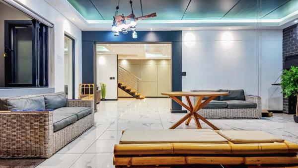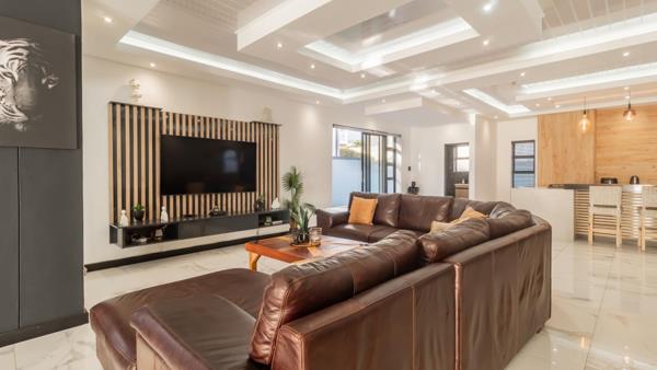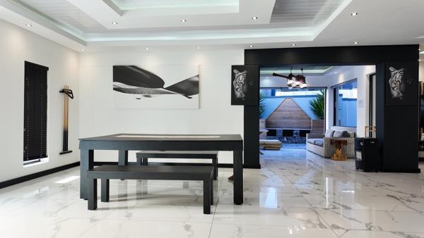 The living area extends into a generously sized entertainment room featuring built-in braai facilities, full-height stacking doors, and large windows that overlook the heated swimming pool, engineered to operate as both a traditional pool and a Kolkol hot tub for seasonal flexibility.