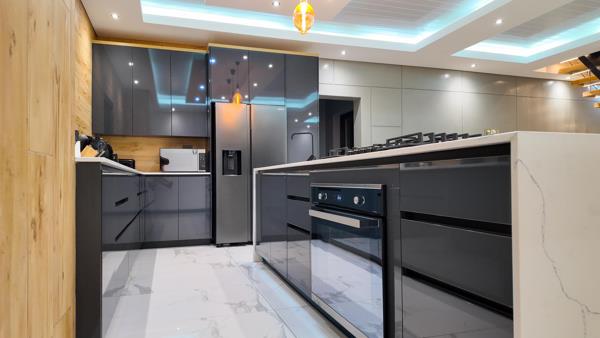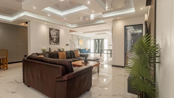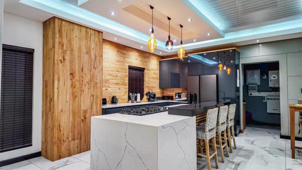 Upon entry, you are welcomed into a sunlit, open-plan living area, and an eye catching designer kitchen. Equipped with high-end appliances, a central island, and a separate scullery.