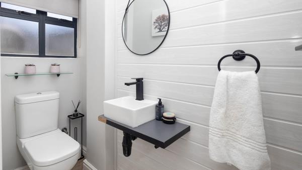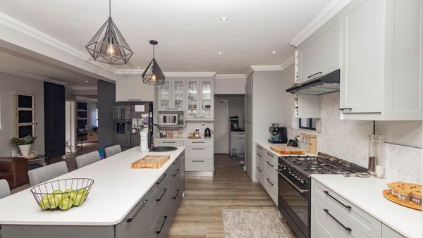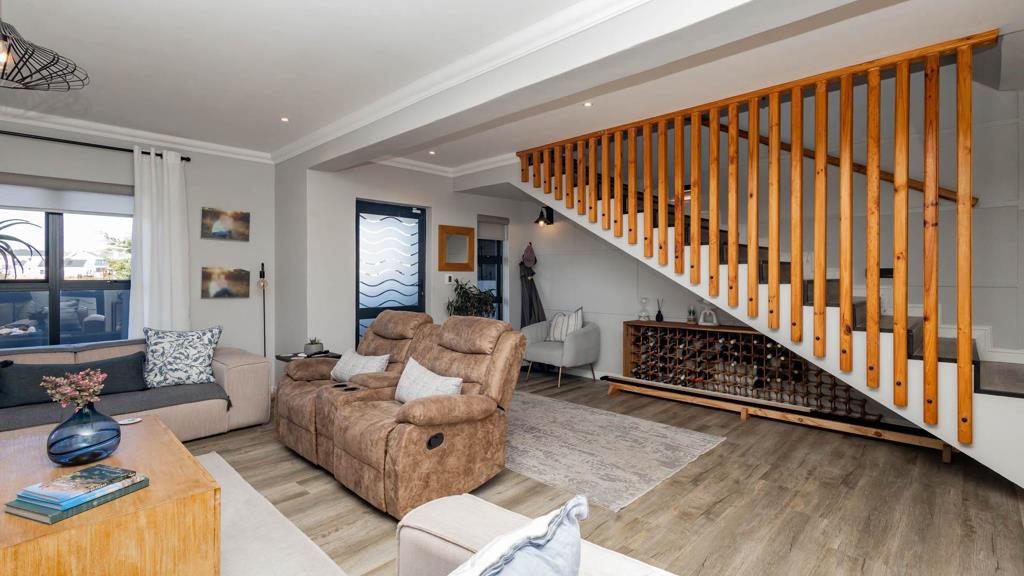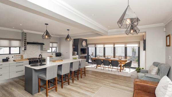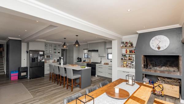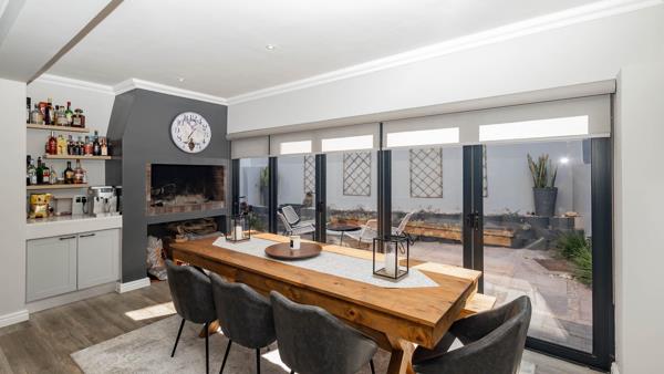 The entrance leads into a warm and inviting family lounge that connects effortlessly with the open-plan kitchen, dining, and indoor braai area. The kitchen is both practical and refined, featuring a spacious separate scullery with direct access to the garage. Large stacker doors open the entertainment area to the back patio, creating a natural connection between indoor and outdoor living. Throughout the home, high-quality vinyl flooring offers timeless appeal and low-maintenance convenience.