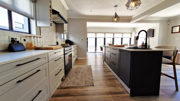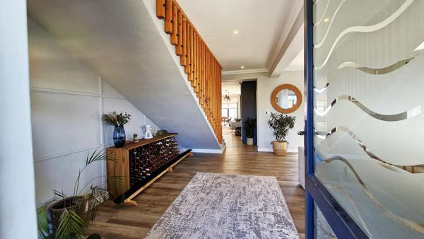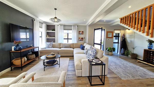 The ground level features a generous lounge that flows seamlessly into a modern open-plan kitchen and an inviting braai room. The braai room opens through concertina doors onto a neatly paved courtyard, creating an effortless indoor-outdoor entertainment space. The kitchen is stylish and contemporary, complete with a separate scullery for added convenience.