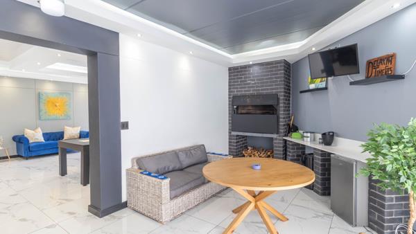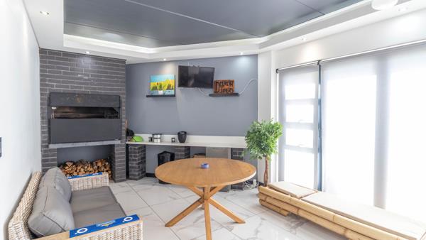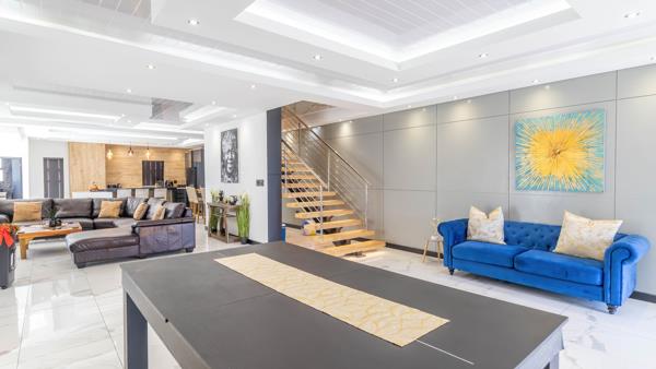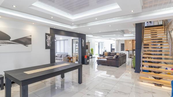 Step into elegance as you enter this stunning home through glass double doors, where a beautifully lit staircase immediately catches your eye. The open-plan lounge, dining, and entertainment areas flow seamlessly, with sliding doors leading to the outdoor space. The braai room features stacking doors for easy access to the outside, along with stacking windows that overlook a relaxing hot tub. Adding to the charm of the outdoor area is a fun 2-hole mini golf course. The home boasts modern finishes, including ceilings with bulkheads and dimmer lights, creating an inviting ambiance. A guest loo is conveniently located on this level.