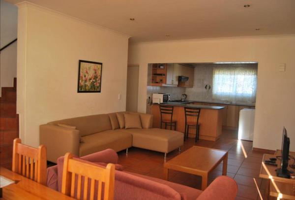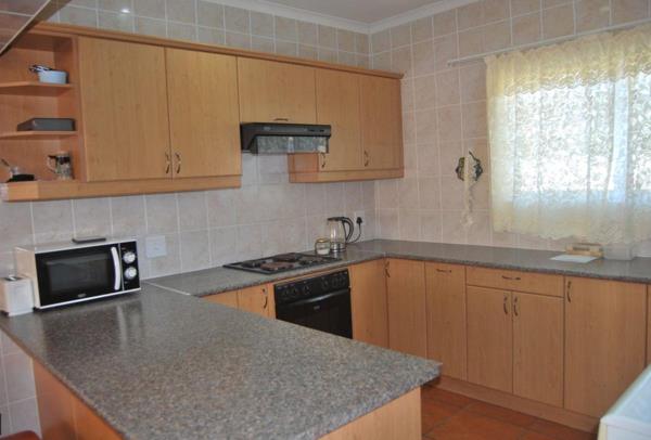 Downstairs, the home features three bedrooms, two bathrooms, and an open-plan living and dining area. The kitchen is well-appointed with ample cupboard space and a separate scullery, perfect for keeping things organized.