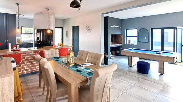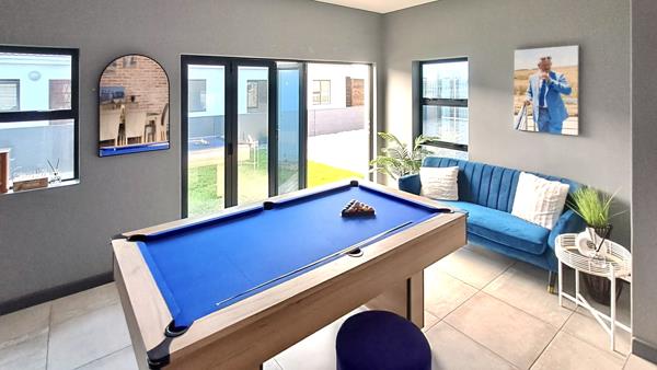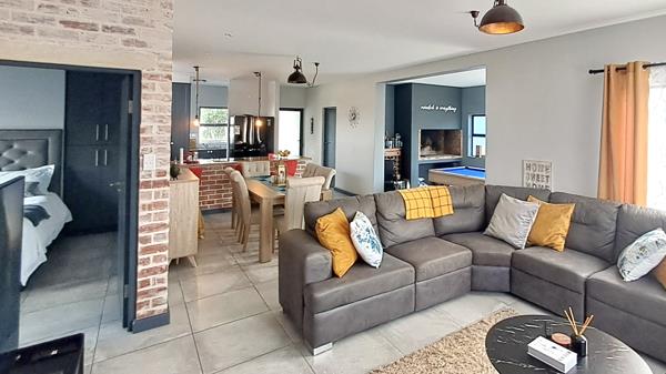 Entertain effortlessly in the open-plan kitchen equipped with an electric oven, hob and ample built-in cupboards. The dining and lounge areas seamlessly flow into an indoor braai area, ideal for gatherings, with stacker doors opening onto the backyard garden.