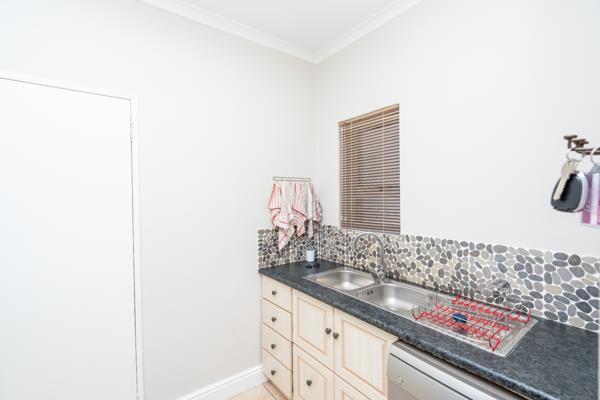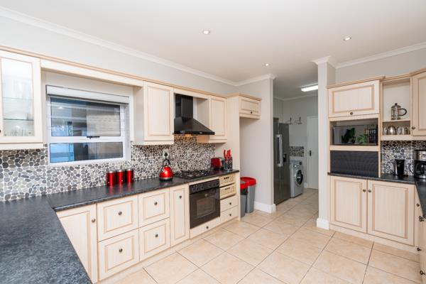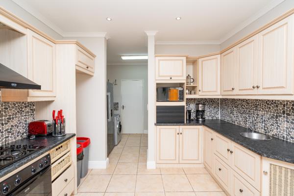 The kitchen is super functional, featuring light-toned cabinetry, dark speckled countertops, and a handy island with seating. You''ll spot a distinctive pebble mosaic backsplash, built-in oven, gas hob, and a dedicated laundry/scullery area, plus a pantry for all your storage needs. Its all about making life a little easier!