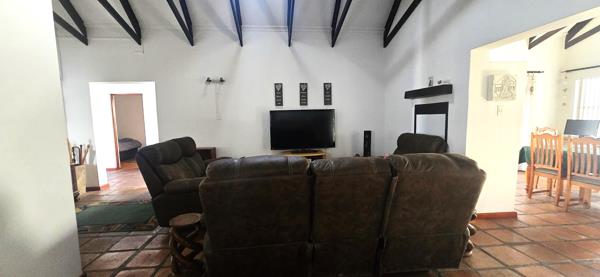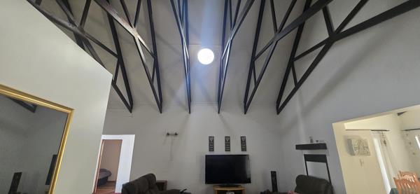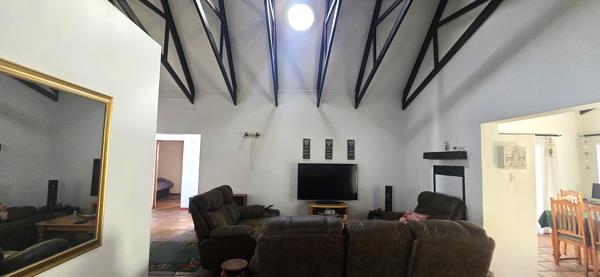 Step inside and be welcomed by high-pitched ceilings with exposed wooden beams, creating a warm and inviting atmosphere. The living spaces flow seamlessly and include a cozy lounge, a welcoming dining area, and a semi-open plan kitchen that offers plenty of cupboard space. A separate scullery adds functionality, keeping the heart of the home neat and organized.