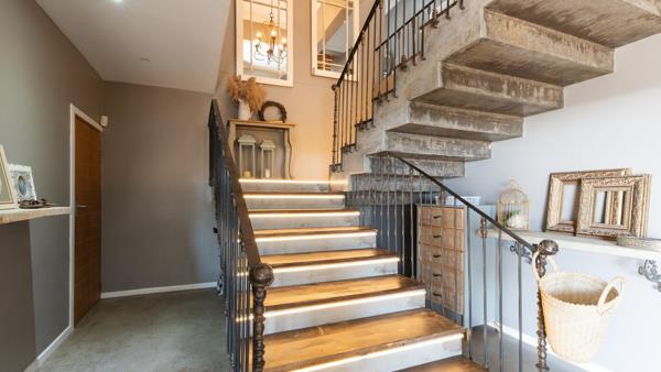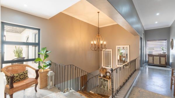 A grand staircase leads you to the main residence, where breathtaking views immediately capture your attention. The open-plan layout combines elegance with ease of living featuring a charming farmhouse-style kitchen with separate scullery and pantry, flowing seamlessly into the dining, braai, and dual lounge areas. Each living space opens onto a north-facing balcony, maximizing natural light and showcasing sweeping vistas.