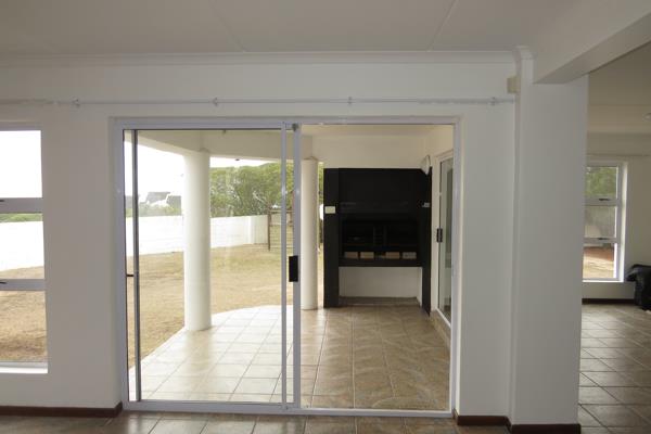 Downstairs features an open-plan living area, kitchen, and dining room, as well as one bedroom with a built-in braai barbecue on an open stoep patio.