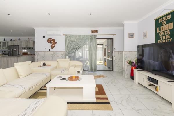 Lovingly maintained by its original owner, the home presents as brand new showcasing stylish marble floors, a beautifully appointed kitchen with engineered stone countertops, and a striking waterfall centre island. The open-plan layout creates a natural flow from the living and dining spaces to the enclosed braai room and outdoor firepit boma perfect for entertaining all year round.