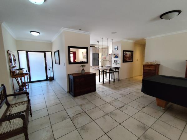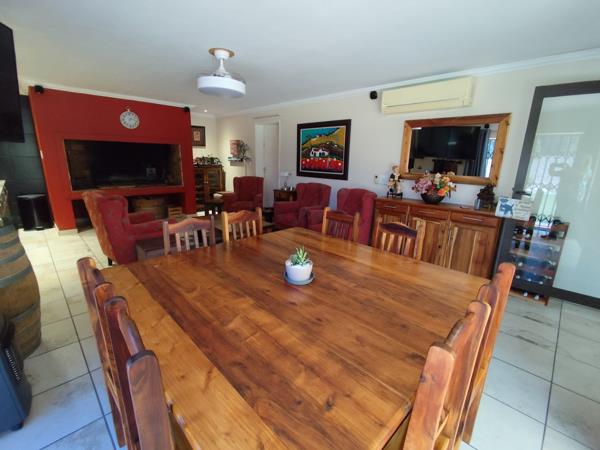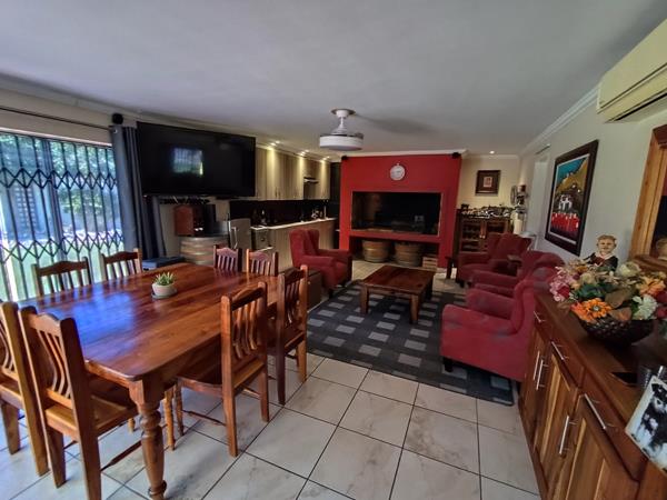 Light-filled living areas open to a large covered patio with a louvre roof, creating the ideal year-round entertainment space overlooking the pool and low-maintenance garden. The main lounge connects to a modern, well-planned kitchen with ample workspace, a separate scullery and laundry. A second lounge with a fireplace and an adjoining indoor braai room, complete with its own gas hob, provide additional space for family or guests, with both areas leading out to the patio.