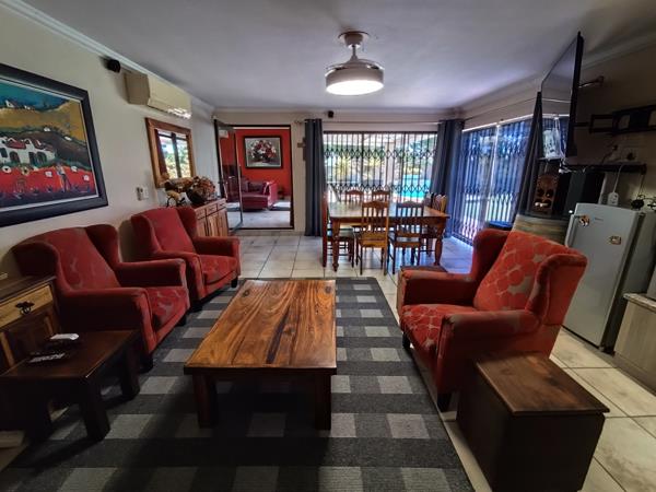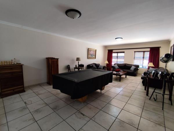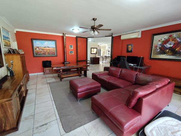Practical features include three tiled garages with built-in cupboards and external access, a dedicated linen cupboard, abundant storage and a large covered parking area suitable for a boat or caravan. The garden is tranquil and easy to maintain, with imitation lawn, mature trees and a fibreglass pool fitted with a heat pump and cover. Additional extras include a 2 kW inverter system, several water tanks, perimeter security beams, burglar bars, Trellidoors and an alarm system, four air-conditioners and eight ceiling fans.