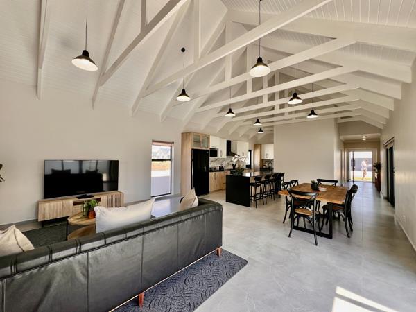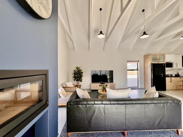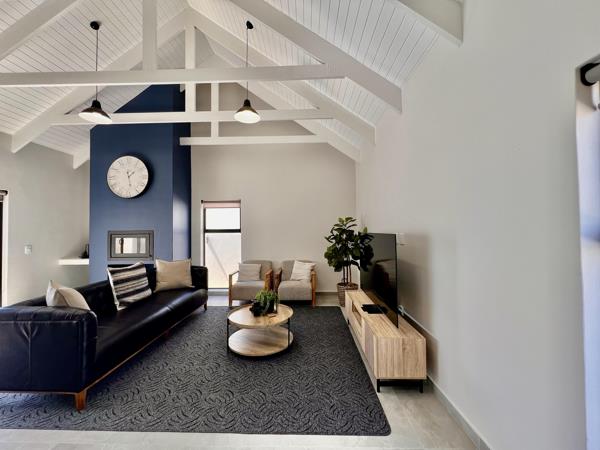 The living area flows seamlessly onto a private, covered patio with a built-in braai, perfect for year-round entertaining.