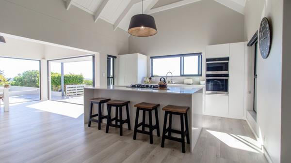 Double-volume living area with built-in braai and seamless flow to a covered patio via stacker doors