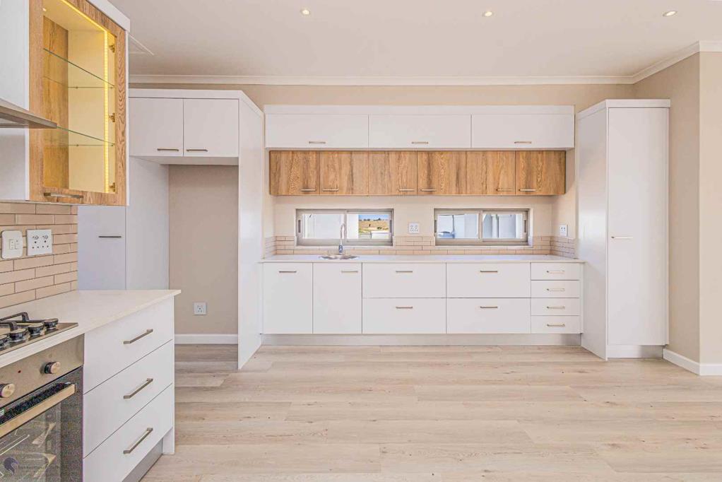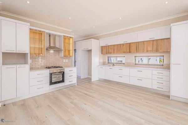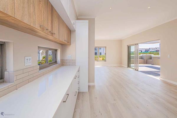 This beautiful home in Chardon Village, located within the secure Langebaan Country Estate, is the epitome of relaxed, modern living. Featuring an open-plan living area that includes a TV room, dining space, and a well-appointed kitchen, this home is designed for easy, comfortable living. The kitchen is fitted with LED-lit display cabinets, soft-close drawers, white Caesarstone countertops, and ample space for a double-door fridge. The Hi-Sense four-burner hob and under-counter oven make it perfect for culinary enthusiasts. A large scullery with plenty of storage and a pantry adds to the home''s functionality, leading out to a convenient drying yard.