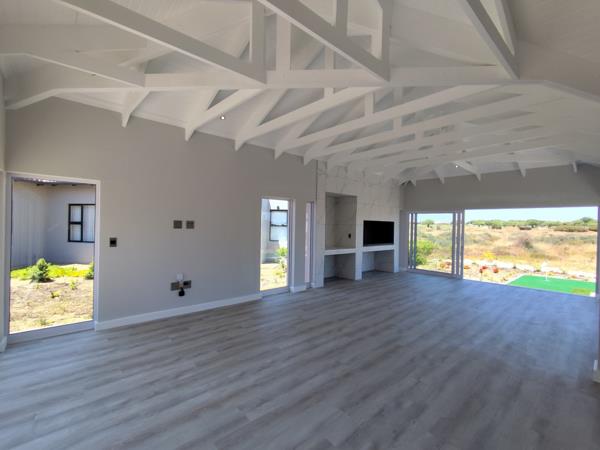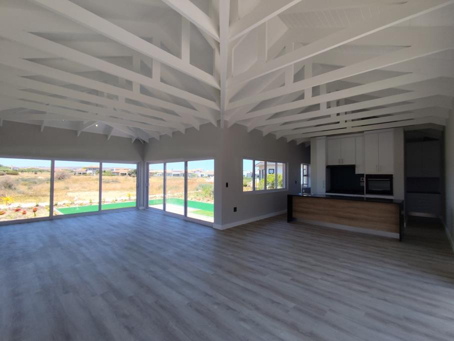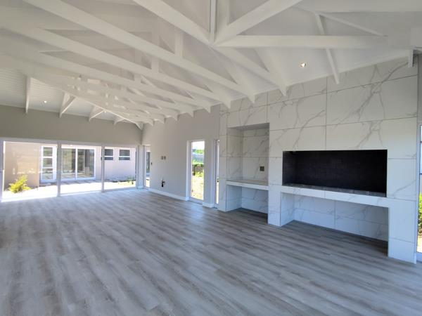 Discover this brand new 4 bedroom home overlooking the 13th fairway on the popular Langebaan Country Estate. This property offers a contemporary design with a light neutral exterior and a generous paved driveway leading to a double garage and an additional single golf cart garage or storage unit.