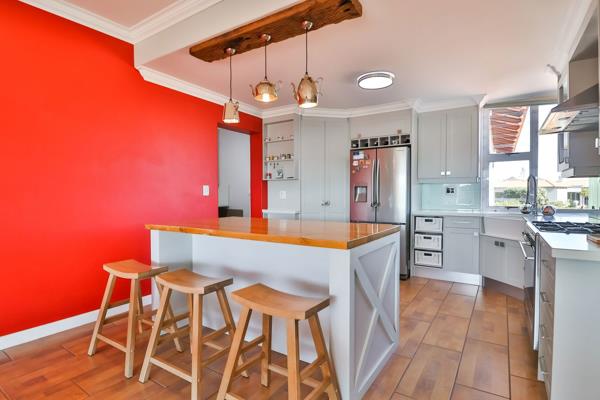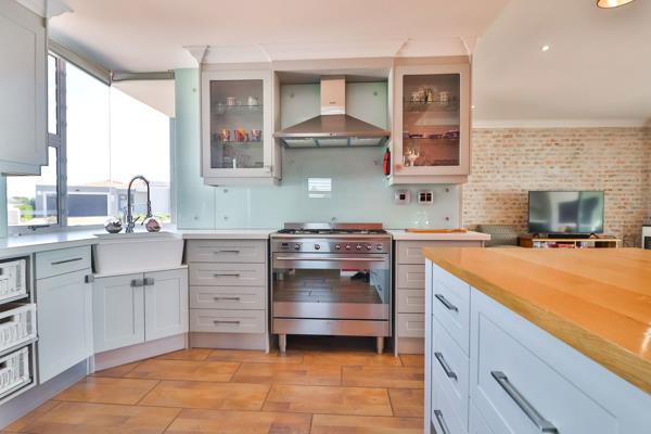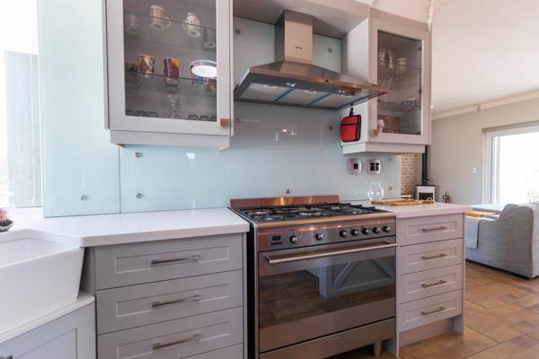 The open-plan kitchen flows seamlessly into the dining area and TV lounge, where a combustion wood-burning fireplace adds warmth and charm, this lovely living area opens out to a large sun-filled indoor braai room while framing the tranquil views of the surrounding landscape.