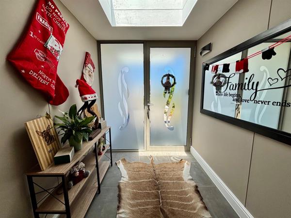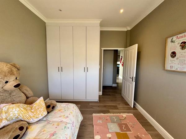 The open-plan design effortlessly connects the kitchen, dining, and living areas, creating a spacious flow ideal for family gatherings and entertaining. The kitchen includes a separate scullery for added convenience, while an indoor braai ensures year-round entertainment no matter the weather.