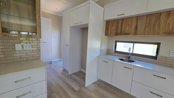 The contemporary kitchen is equipped with top-of-the-line appliances, and a generously sized scullery tucked away behind the kitchen helps keep everything neat and organized. The scullery also includes extra storage cupboards for added convenience.