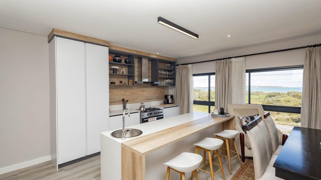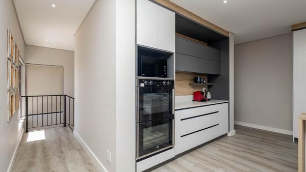 The open-plan kitchen is both modern and practical, designed with the passionate home cook in mind. Featuring an eye-level electric oven and gas hob, this space allows you to prepare meals with both precision and style. An extractor fan ensures a fresh environment while cooking, and ample built-in cabinetry offers generous storage. The adjoining separate scullery provides additional workspace, laundry connections, and a discreet area to manage household chores away from the entertainment zones.