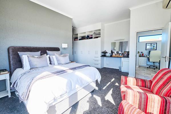 Upstairs houses the airconditioned main en suite bedroom, an office, and a wrap-around balcony offering stunning sea views on one side and views of West Coast fynbos veld and the driving range on the other. The main bedroom is elegantly decorated with plush carpets and rich curtain fabrics, creating a cozy luxurious haven. Stackable sliding doors open completely to reveal breathtaking views. The spacious walk-in wardrobe complements this abundant space.
