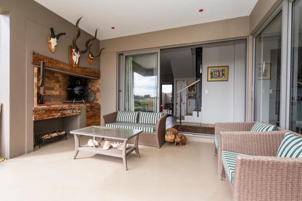 Large windows and sliding doors throughout the property maximize natural light and frame the captivating golf course views. The upstairs lounge opens onto a covered balcony with a north-facing built-in braai area, equipped with all-weather blinds for year-round enjoyment.