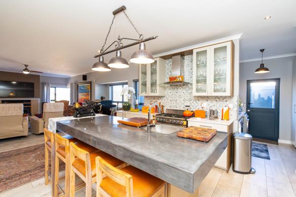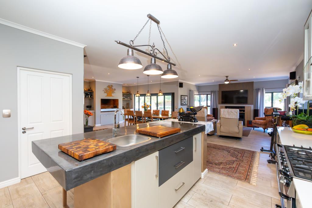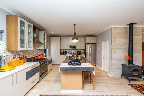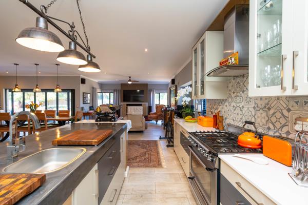 The living areas include a lounge with surround sound, a dining room with a wood-burning fireplace, and a modern kitchen featuring a centre island, Smeg Victoria stove, and pantry. Theres also a scullery, home office, and an indoor braai room with stacking doorsideal for year-round entertaining.