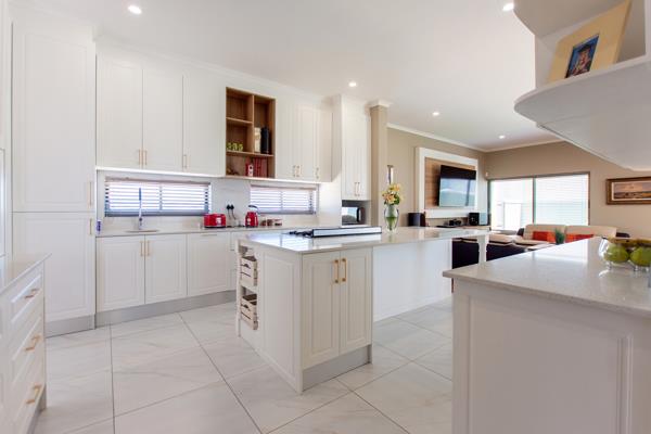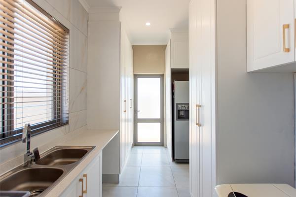 Step through the front door into a light-filled entrance hall that flows effortlessly into the open-plan living areas. The kitchen is a chefs dream crisp white speckled granite countertops, a freestanding gas stove with electric oven, a generous centre island ideal for entertaining, and an abundance of cabinetry. A separate scullery and laundry opens to a walled drying yard, keeping household tasks tucked out of sight.