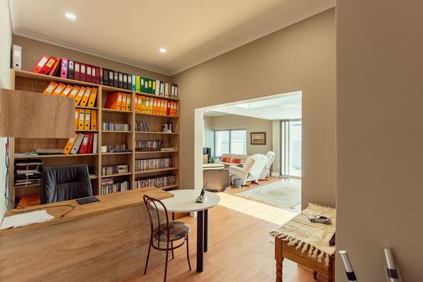 The spacious lounge creates a welcoming heart of the home, flowing into a sun-soaked braai room with a stainless-steel built-in braai, basin, and stacking doors that open to a private walled garden the perfect setting for relaxed alfresco dining or quiet afternoons with a book. A charming study nook with built-in bookshelves offers a peaceful corner for work or creative pursuits.