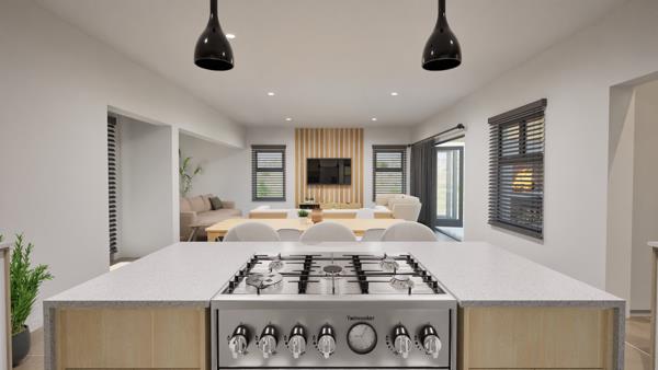 Perched on a higher elevation in the newly released Le Juille plots within the prestigious Langebaan Country Estate, this home offers breathtaking views and a thoughtfully designed layout. As a Plot and Plan opportunity, buyers benefit from savings on Transfer Duty. Designed for both comfort and style, the home features four bedrooms, with three located downstairs and the master or guest suite privately positioned upstairs. Downstairs, two bedrooms share a full bathroom, while the main bedroom boasts an en-suite with double vanities. The upstairs master/guest suite also includes an en-suite with double vanities. The home offers two loungesone downstairs, seamlessly connected to the dining area and kitchen, and another upstairs with exposed trusses and a spacious braai area that opens onto a balcony, perfect for entertaining. For vehicle and storage needs, the generous 52m garage includes space for two cars and a golf cart.