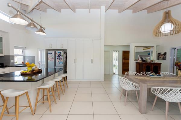 Designed for effortless living, the open-plan layout seamlessly links the dining area, lounge, and sleek contemporary kitchen. The kitchen combines style with function, featuring snow-white cabinetry, gleaming granite countertops, and a custom alcove for a double-door fridge. The adjoining scullery is neatly plumbed for both a dishwasher and washing machine, ensuring the main space remains uncluttered. Culinary enthusiasts will appreciate the premium gas hob and extensive preparation areas.