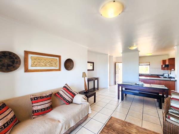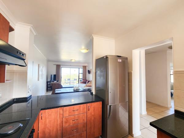 The apartment features an open-plan lounge and dining area that leads out onto a balcony with lovely views towards the Langebaan Lagoon the perfect spot to enjoy your morning coffee or a sunset with family and friends.