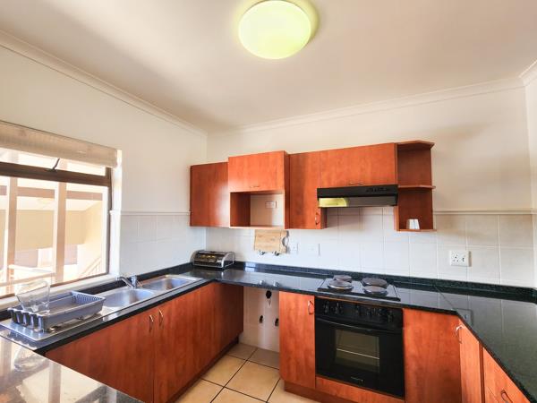 The kitchen is functional, with plenty of cupboard space and room for appliances. All three bedrooms are well-sized with built-in cupboards, and the apartment includes two bathrooms for convenience.