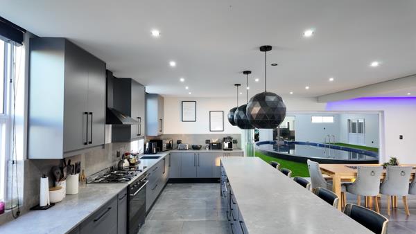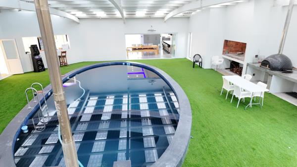 An exceptional feature of this home is the expansive indoor swimming pool, surrounded by artificial grass. A wood-fired pizza oven and Jacuzzi enhance the ambiance, creating the perfect setting for relaxing and entertainment.