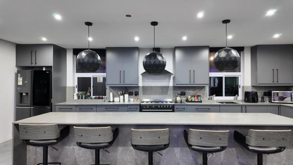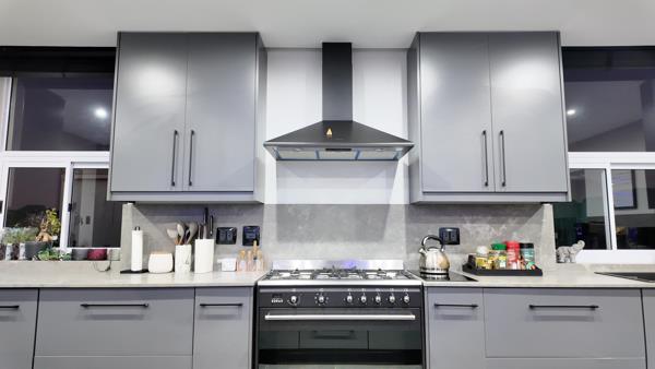 The kitchen features sleek marble countertops, ample storage space, and modern amenities including a gas stove and extractor fan. Adjacent to the kitchen, a practical scullery and pantry provide added convenience.