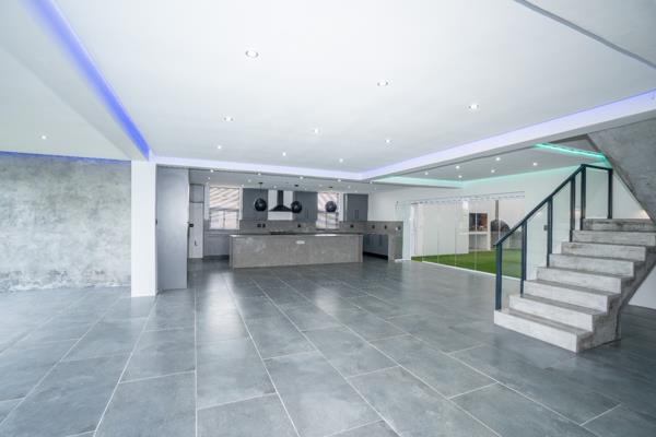 Vast open-plan kitchen and dining area, seamlessly flowing into the living and entertainment spaces.