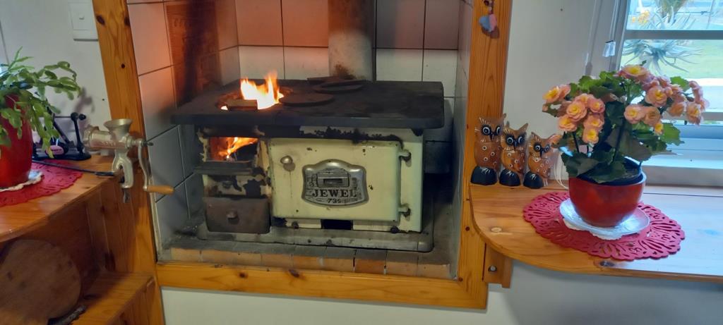 Expansive farm-style kitchen with electric, gas andamp Jewel coal stove